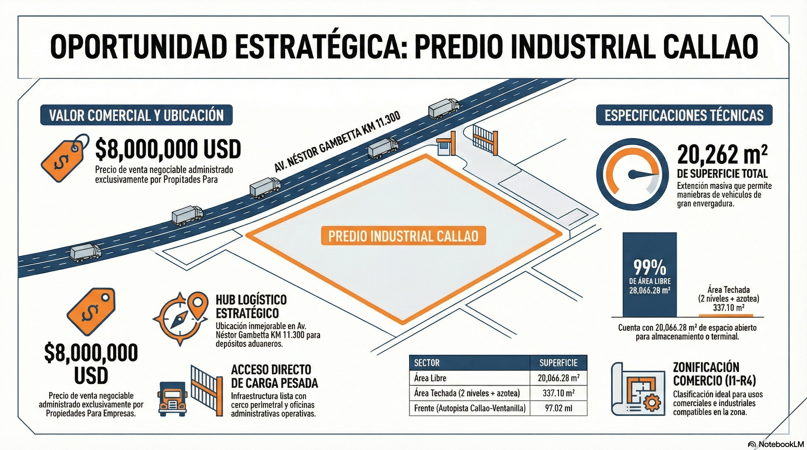 Se pone a la venta un activo industrial de gran envergadura ubicado en el corredor logístico más importante del Callao. Esta operación se presenta bajo una estructura ideal de adquisición corporativa (Share Deal), ofreciendo la transferencia de la empresa titular del inmueble para una transacción rápida y limpia.
