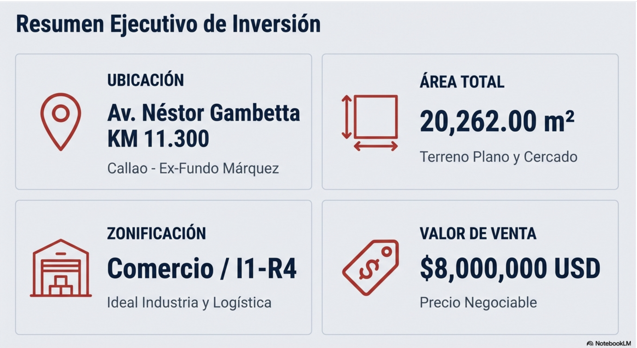 El inmueble se identifica como el Sub-Lote D, Sector 10-E, del Ex-Fundo Márquez. Se encuentra exactamente en el KM 11.300 de la Av. Néstor Gambetta, una vía crítica que conecta el Callao con Ventanilla, lo que garantiza un acceso directo para transporte pesado.