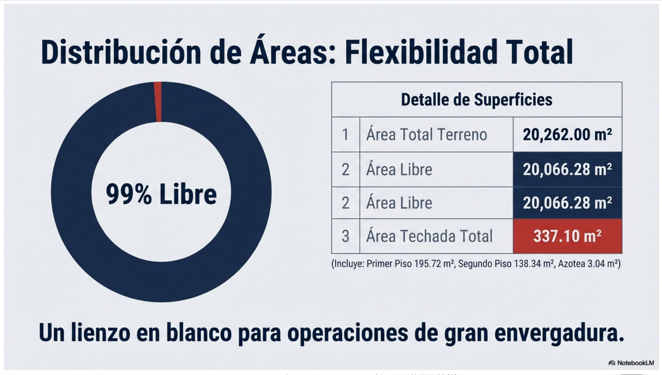 • Área Libre: 20,066.28 m² (representa la gran mayoría del predio,