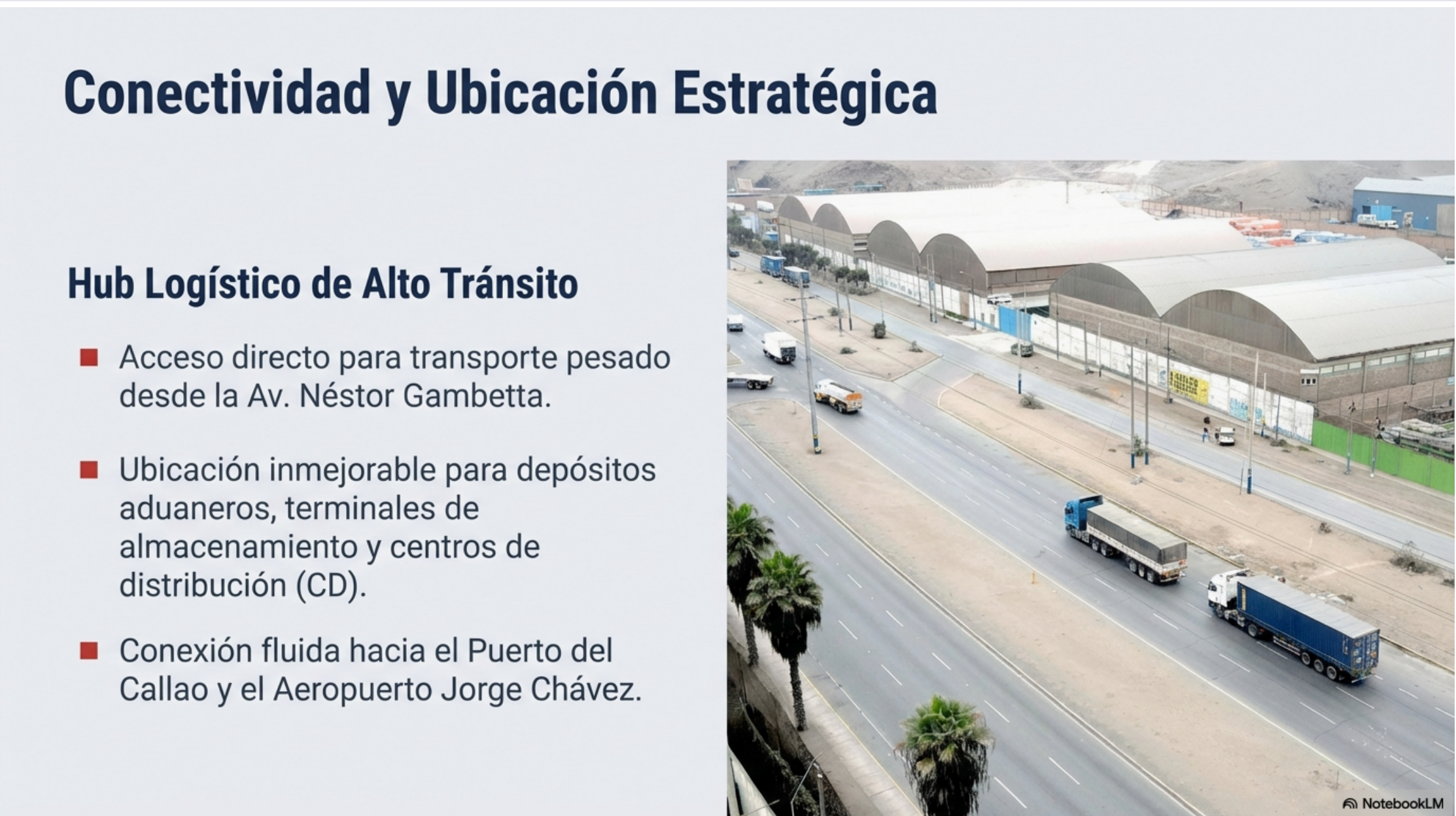 El inmueble se identifica como el Sub-Lote D, Sector 10-E, del Ex-Fundo Márquez. Se encuentra exactamente en el KM 11.300 de la Av. Néstor Gambetta, una vía crítica que conecta el Callao con Ventanilla, lo que garantiza un acceso directo para transporte pesado.